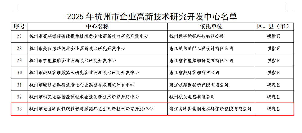 近日,由浙江省IM电竞生态环保研究院有限公司创建的“杭州市生态环保低碳数智资源循环企业高新技术研究开发中心”,成功入选2025年杭州市企业高新技术研究开发中心名单,标志着生态环保研究院在科技创新领域取得重要突破,迈入新的发展阶段。