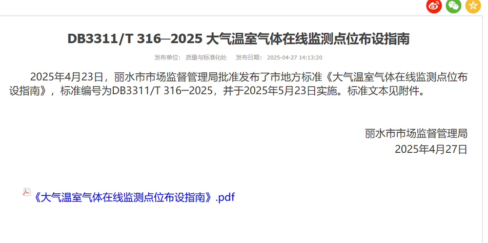 2025年5月23日,由省IM电竞牵头起草的地方标准《大气温室气体在线监测点位布设指南》(标准编号:DB3311/T 316─2025)正式实施。