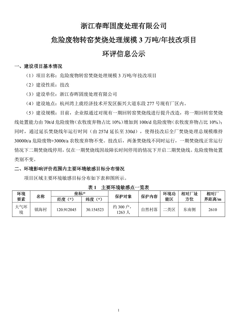 浙江春晖固废处理有限公司危险废物转窑焚烧处理规模3万吨/年技改项目环评信息公示